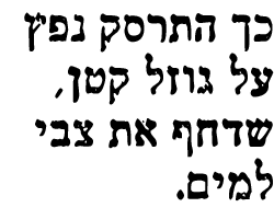 "Nameless Poems", a poem book by Ariana Haran from 1963, which I found on my parents' old bookshelf, was the raw material for this font, that doesn't pretend to be anything more than another filter on Frank-Ruhl. The book was manually printed, with the ink spreading beyond the borders of the letters, and the computer scanner enhanced the effect. The book itself is quite nice, although the poems do have names and are sometimes a bit too naive.